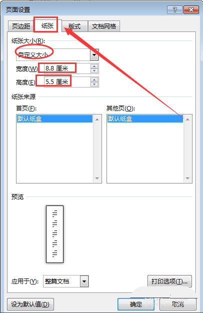 5、然后切换到纸张设置面板,选择纸张大小为自定义大小,名片的最合适的高度和宽度分别是8.8厘米和5.5厘米,设置好后点击确定。