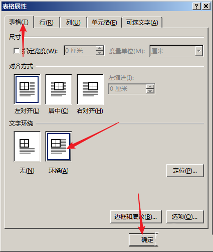 4、在打开的窗口中,在【表格】选项卡中点击【环绕】,点击【确定】。