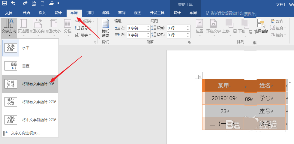 6、选中表格,点击【布局】—【文字方向】—【将所有文字旋转90°】。