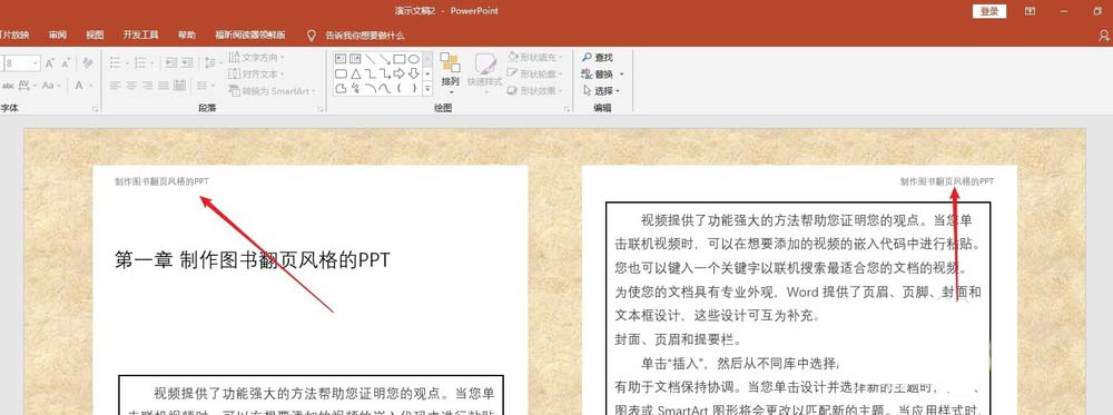 6、在顶部插入PPT文件名和章节名,就像书的页眉。