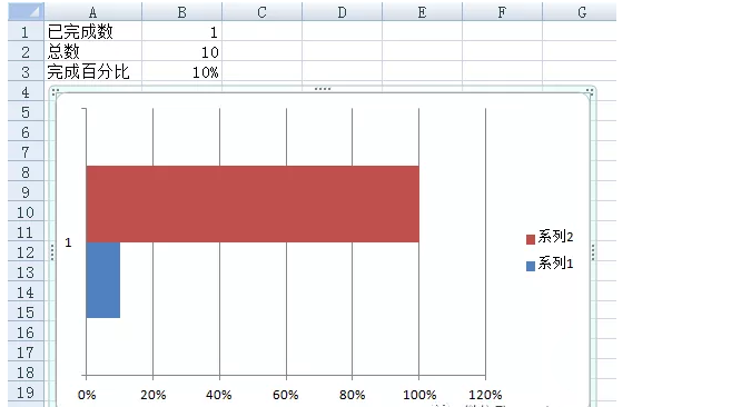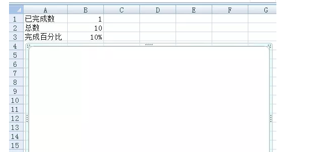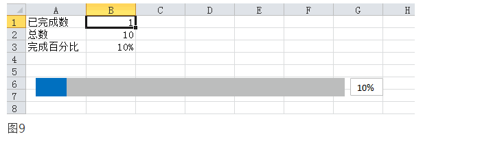 9、此时,我们改变已完成数的值,图表会自动更新,展示进度情况,如图9所示。在图表的右侧,添加了一个文本框,与单元格B3链接,以显示进度值。
