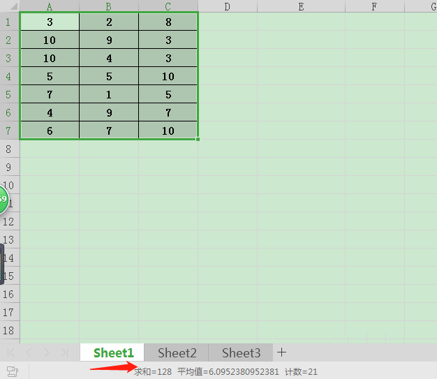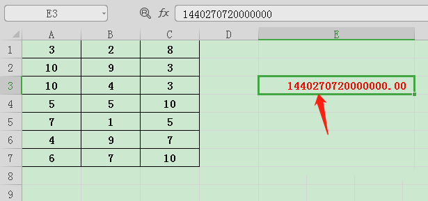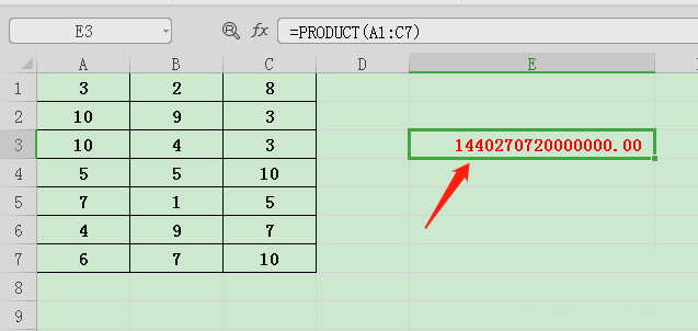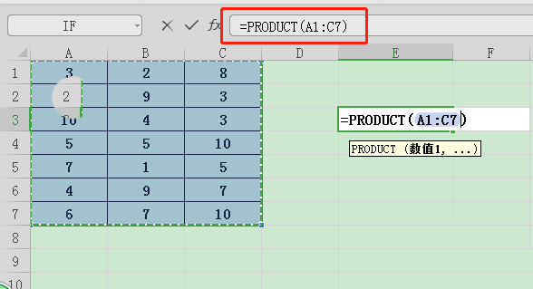 3、在单元格中输入公式‘=PRODUCT(A1:C7)’(如图);