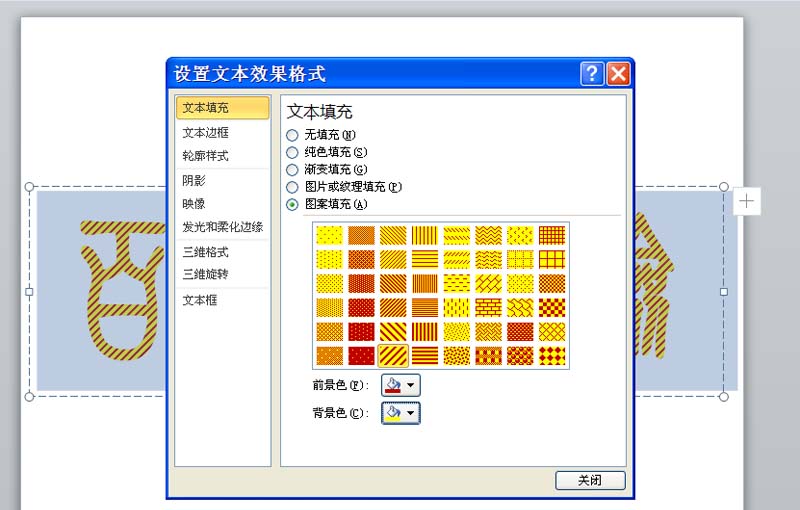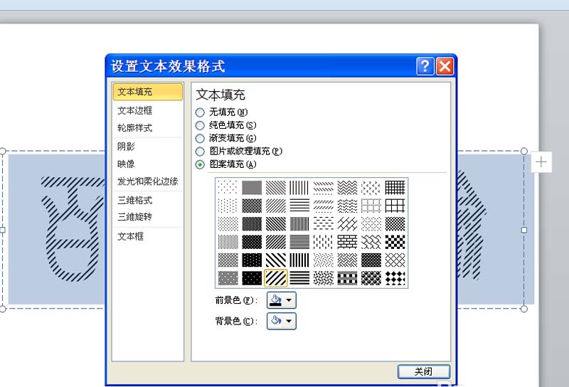 4、设置文本填充为图案填充,并选择自己喜欢的一种图案类型。