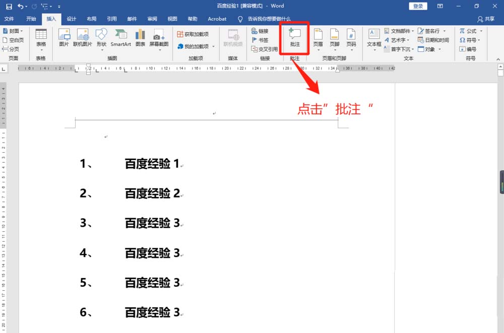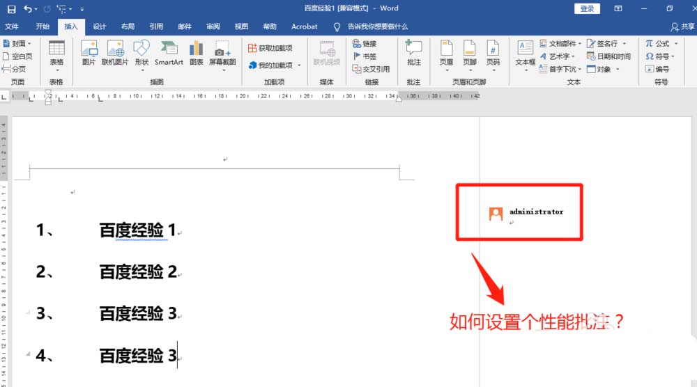 5、Word2016设置本人名字批注完成后,在文档”插入“菜单子窗口,点击”批注“查看设置效果。