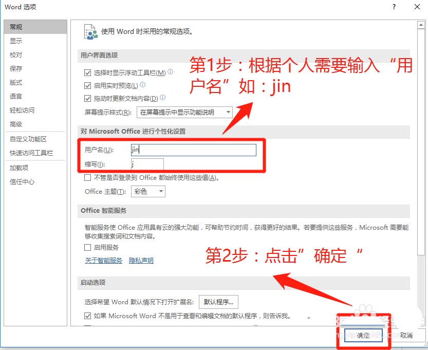4、在“Word选项”的常规子窗口,根据个人需要输入用户名和缩写,并点击“ 确定“选项。