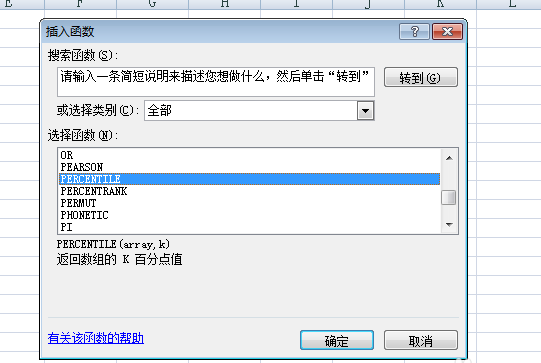 3、弹出函数搜索框,找到函数PERCENTILE,点击确定;