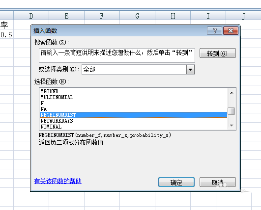 3、弹出窗口,找到函数NEGBINOMDIST,找到后点击确定;