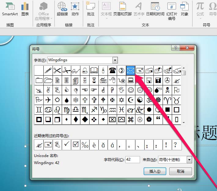 7、在wingdings页面中,找到邮件的图标。