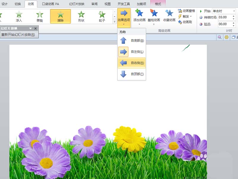 5、接着设置效果选项为自右侧,设置持续时间为3秒,开始为单击。