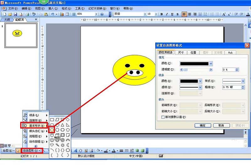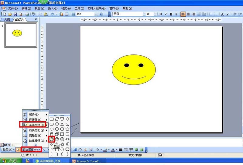 1、打开PPT2003,新建一空白文档——删除空白文档里的文字文本框——点击自选图形——基本形状——笑脸,先用笑脸画头部。再用两个小圆填充黑色遮住原来的眼睛。