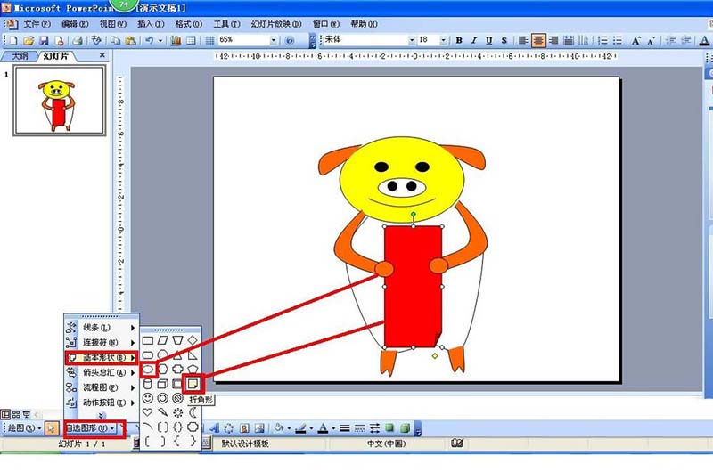 4、再下来,也在自选图形的基本形状那里选择折角形,在猪的双手中间画一个填充红色的折角形。然后再画两个小圆当作小手抓住折角形。