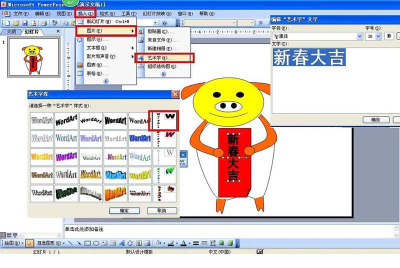 5、点击插入——图片——艺术字——选择坚体黑字的艺术字样式——然后在文字编辑框中输入:新春大吉,并设置为黑体加粗。