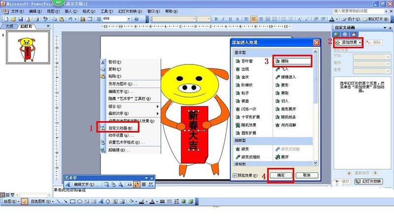 6、最后设置字体的动画效果:右击字体——自定义动画——添加效果——选择擦除的效果(也可以设置其它身体部位的动画效果)。此外还可以加上一些背景图案上去,增加年的氛围