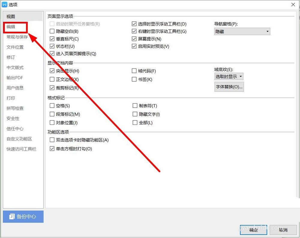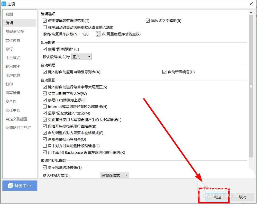 4、选择“选项”中左边一列的“编辑”单击