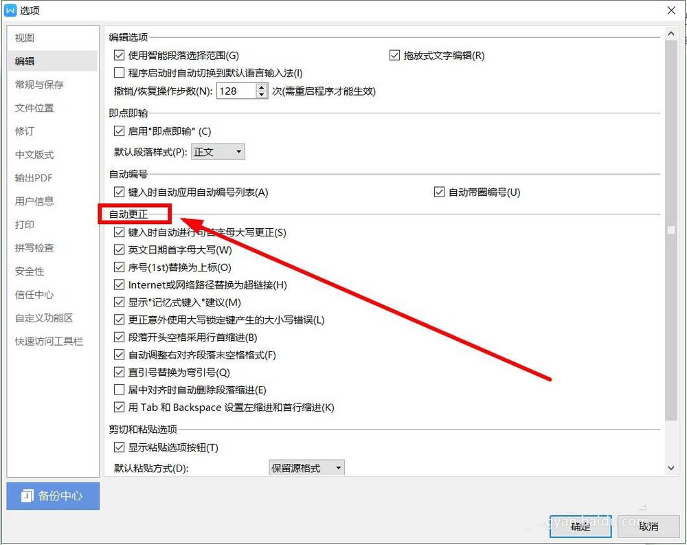 5、在页面右侧找到“自动更正”选项