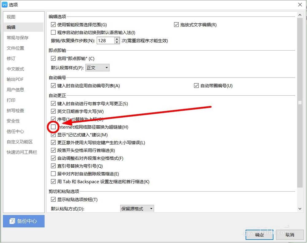 7、在这里的“internet及网络路径替换为超链接”前面的方框单击,去掉勾选该项