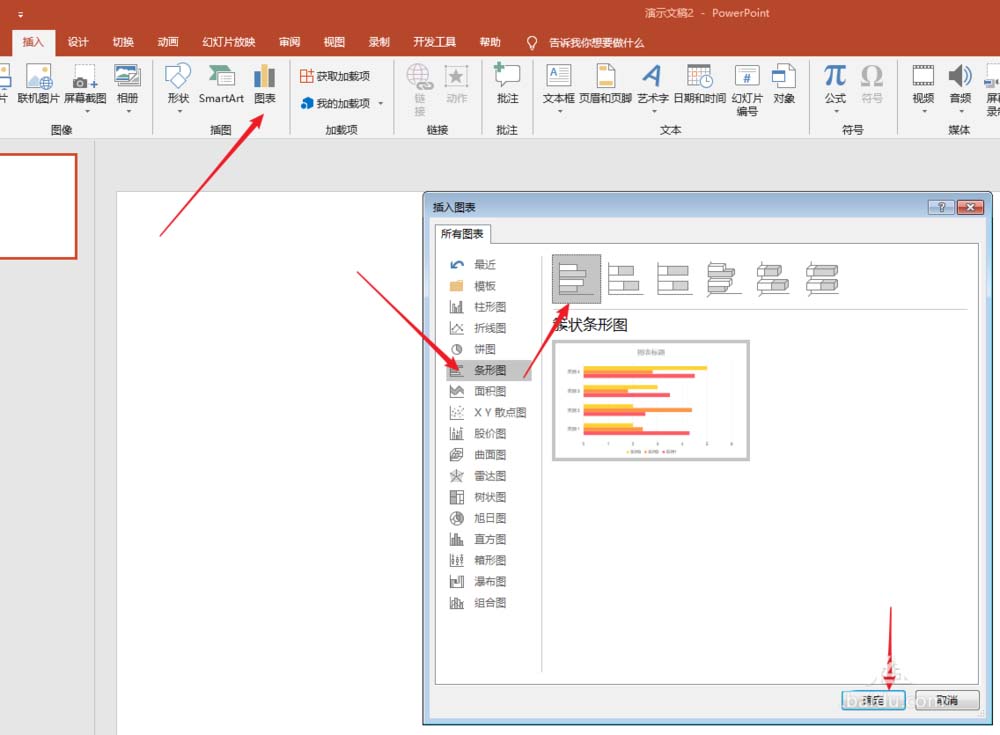 2、点击【插入】—【图表】—【条形图】—【簇状条形图】,点击【确定】。