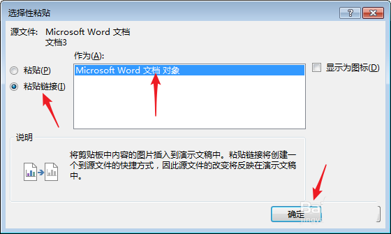 7、在打开的窗口中,点击【粘贴链接】—【Microsoft Word 文档对象】,点击【确定】。