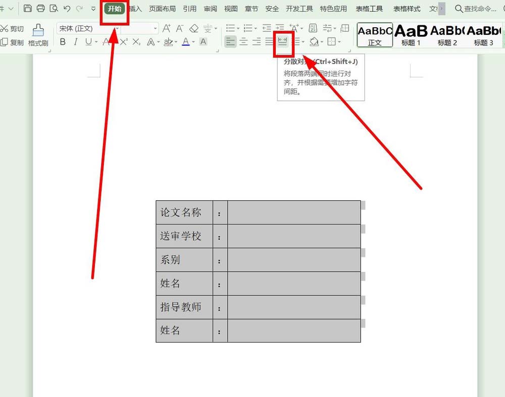4、选中所有的表格,单击“开始”选项卡,在菜单栏“分散对齐”单击,让字体摆放美观一些