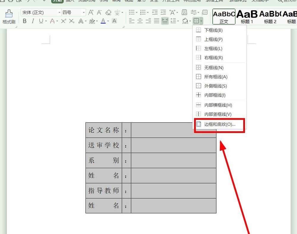 5、全选表格,单击“边框”后面的下拉箭头,并在下拉菜单中选择“边框和底纹”单击