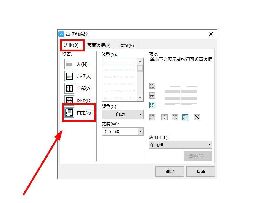 6、在“边框和底纹”对话框,在默认打开的“边框”选项卡中找到“自定义”单击