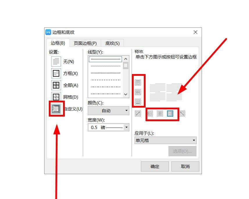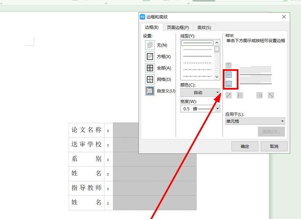 9、在“边框和底纹”对话框,依然使用“自定义”这项功能,单击“添加中横线”和“添加下框线”,完成后单击“确定”