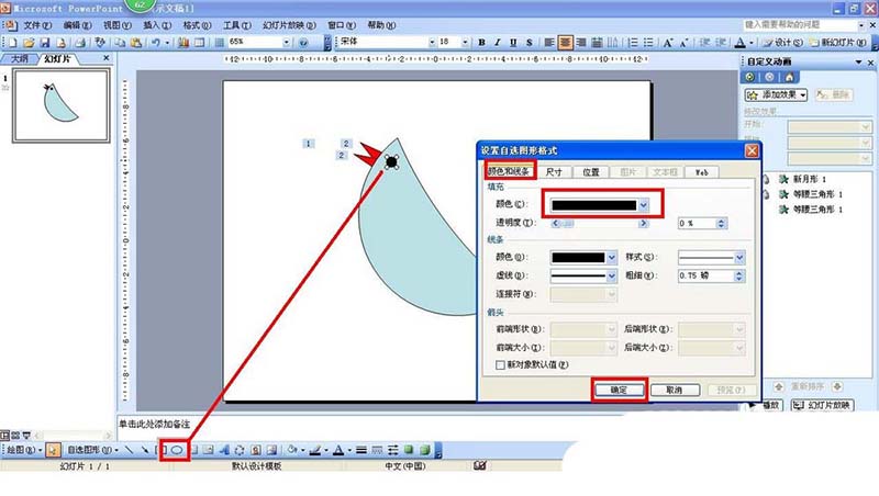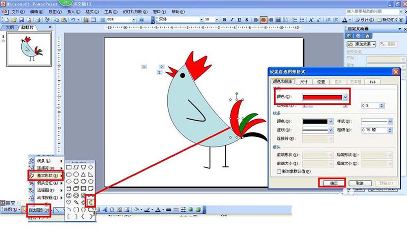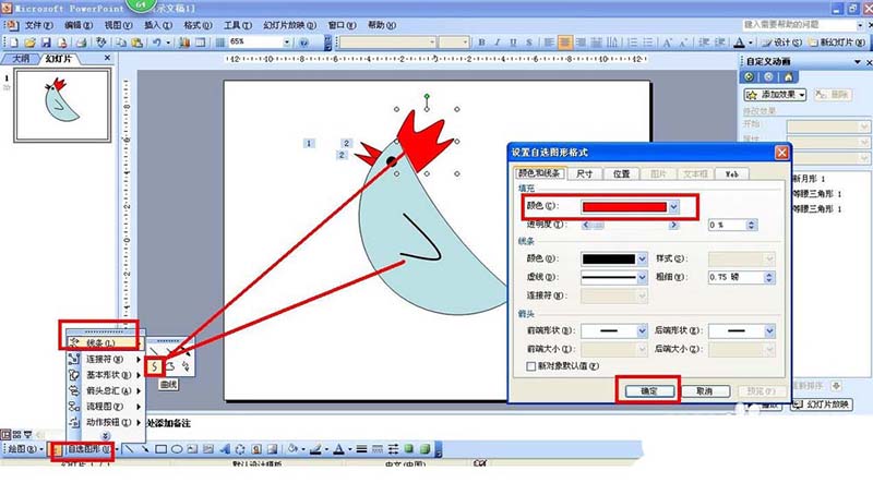 5、点击自选图形——线条——曲线,用曲线画鸡冠,并填充红色,设置擦除动画——再用曲线画翅膀,保留黑色,也设置擦除动画。