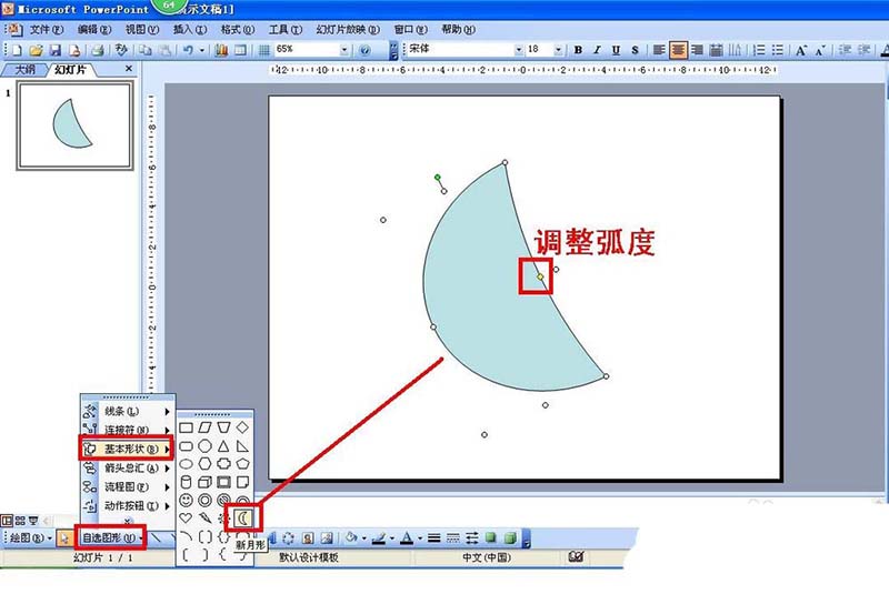 1、在PPT编辑页面那点击自选图形——基本形状——选择月亮——然后画一个月亮——点击月亮的黄色弧线调整点,把弧线调整成差不多成直线那样,这样就画成一个弓形。