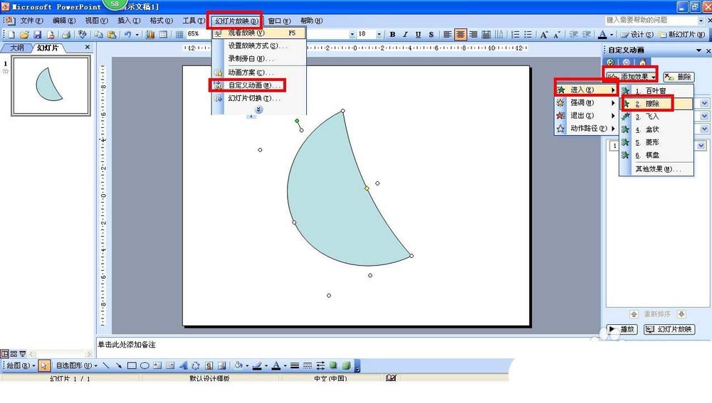 2、制作弓形动画。选择弓形——点击幻灯片放映——自定义动画——添加效果——进入——擦除,设置成擦除的动画。后面所有的图形动画都制作成擦除动画。