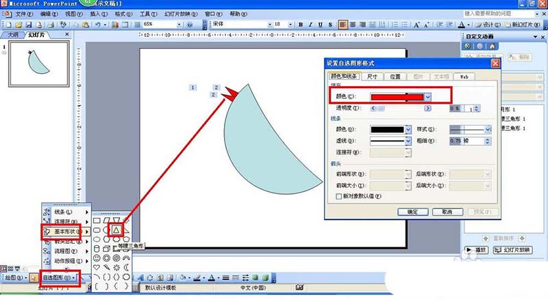 3、在自选图形的基本形状那里选择等腰三角形,然后再复制粘贴一个等腰三角形,制作成公鸡的嘴角——双击把嘴填充成红色——同步骤2方法制作擦除动画。