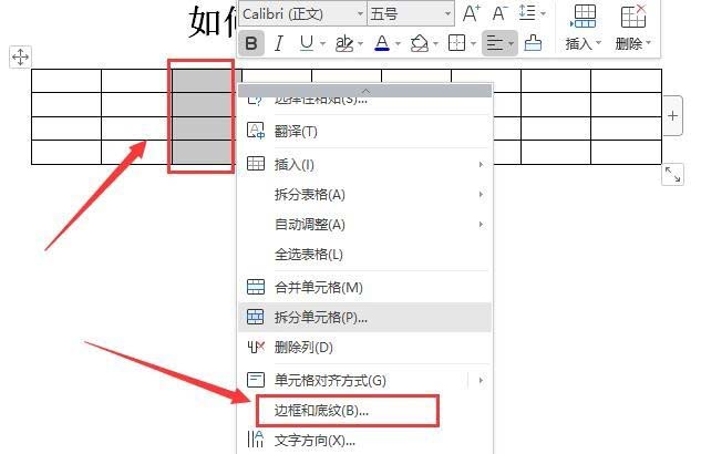 4、选中表格的任意一列,右击,弹出菜单,下拉选项,选择“边框和底纹”(如下图)