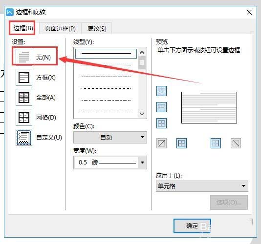 5、在弹出的对话框中,选择“边框”,设置“无”,然后点击“确定”,文档中,就会显示此列都是虚线的了(如下图)