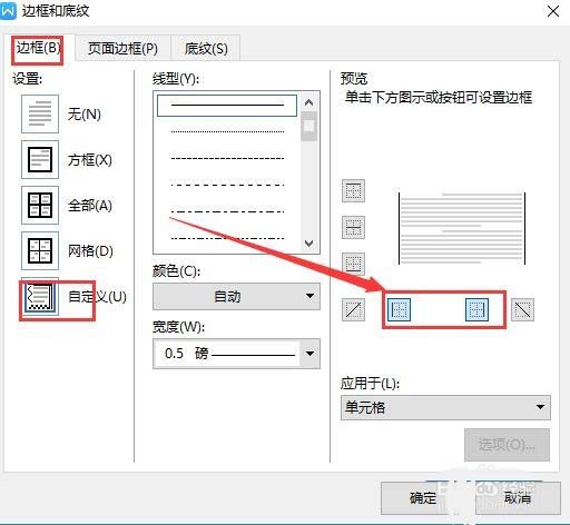 6、继续选中此列,然后右击选择“边框和底纹”,在弹出的对话框中,选择“边框”,“自定义”,在预览处,选择左右竖线,然后点击“确定”(如下图)