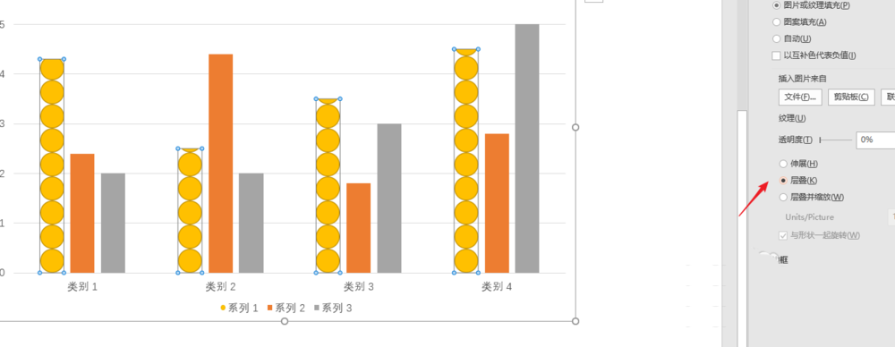 5、我们继续选择下面的层叠即可完成,当然,如果我们选择缩小层叠选项,会出现不同的填充样式,大家可以找一些更加生动的图案用这个方法去填充我们自己的柱状图,希望能够对大家有帮助。