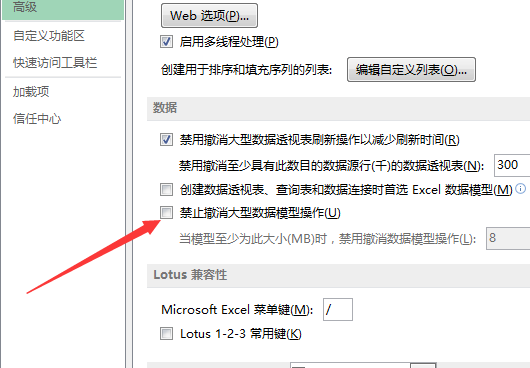 5、点击了高级的选项之后,勾选上禁止撤销大型数据模型操作的选项