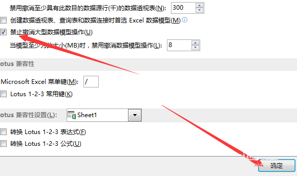 6、勾选上了一个禁止撤销大型数据模型操作,点击确定保存设置。