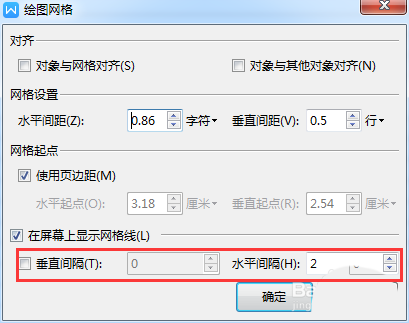 8、在弹出的绘图网格界面中,我们看到最下面的在屏幕上显示,下面有垂直间隔、水平间隔,可以根据需要进行相应的设置,然后点确定。