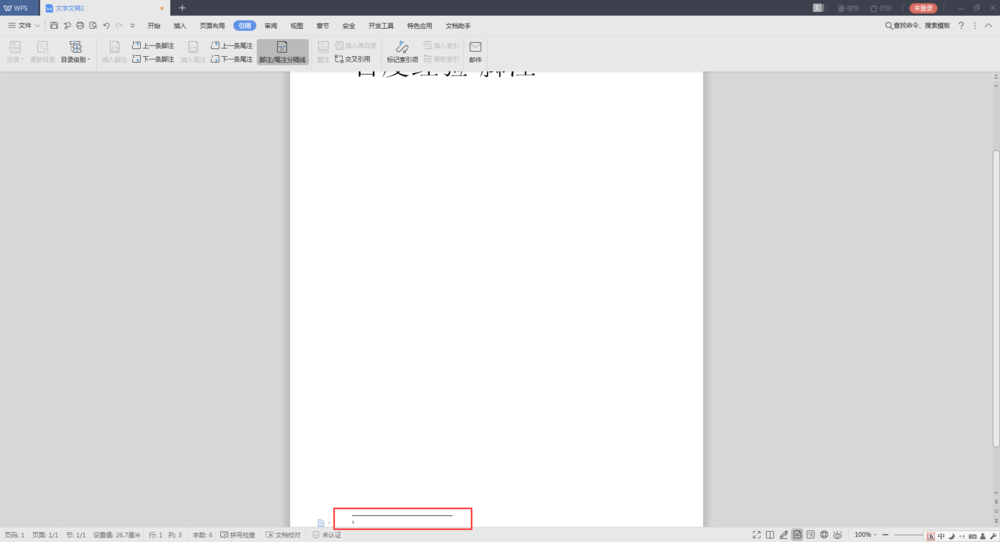 4、当点击完插入脚注之后,我们从文档的最下面可以看到有一个编号1在文档底部。
