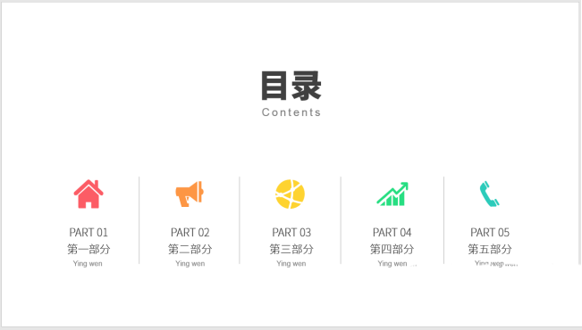 6、在文字下方添加上装饰性的英文。这样,图标并列式PPT目录就制作完成了。