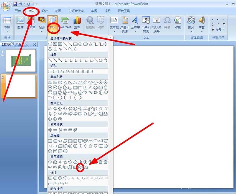 2、在新建的幻灯片上找到菜单栏中的“插入”,插入一个背景图片。这里选择的是“形状”中的“横卷形”
