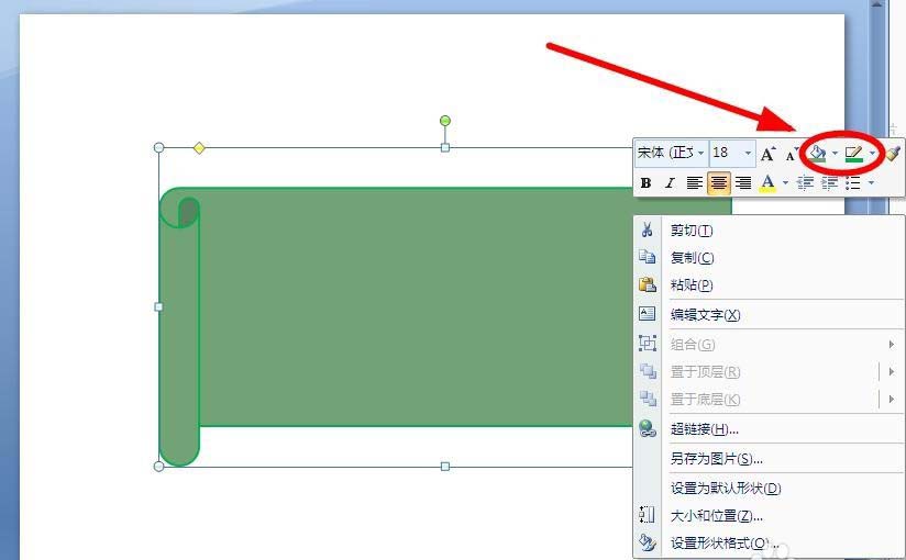 3、选中插入的横卷形,右键在图片工具中调整背景色、轮廓至感觉合适