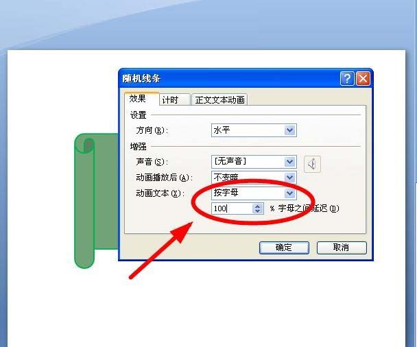 12、“效果”中的方向设置为“自左侧”,“动画文本”设置为“按字母”,“字母间延迟”设置为“100”