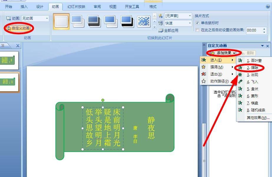 10、类似于第一个文本框的动画设置,选中第二个文本框,单击“自定义动画”中的“添加效果”设置动画效果为“檫除”,依次单击“添加效果”——“进入”——“檫除”,把动画设置成檫除效果