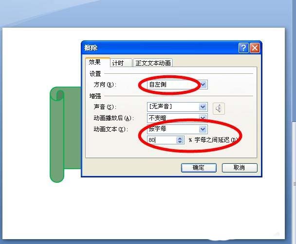 16、“效果”中的方向设置为“自左侧”,“动画文本”设置为“按字母”,“字母间延迟”设置为“80”