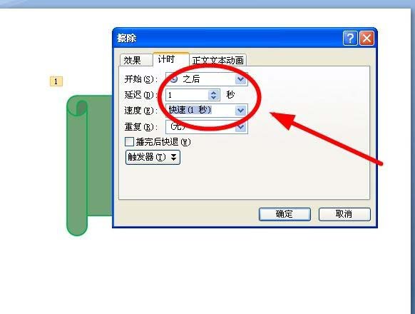 17、在“计时”选项卡中,设置“开始”为“之后”,“延迟”为“1秒”,“速度”为“快速(1秒)”,设置完成单击“确定”