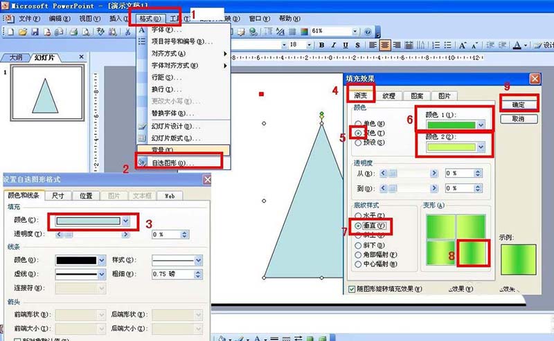 2、选择等腰三角形,点击格式——自选图形——颜色填充选择颜色填充——渐变——双色——一种选择绿色——一种浅黄色——垂直——选择第四种