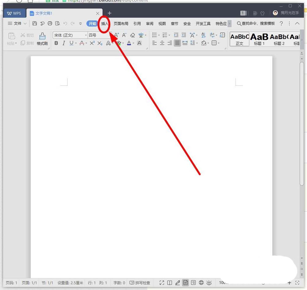 1、新建一个文档,找到菜单栏的“插入”按钮单击