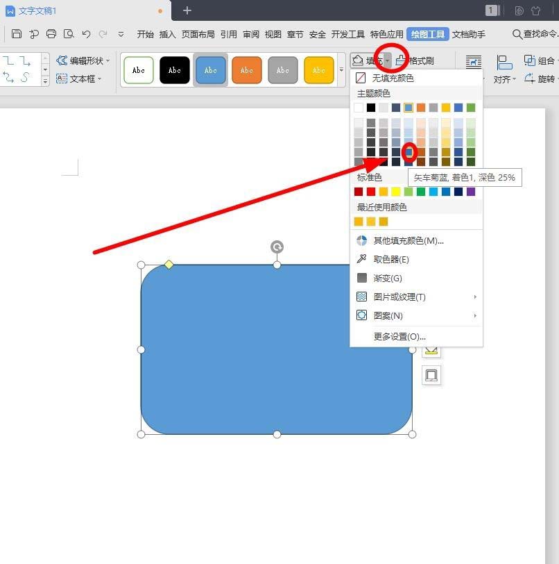 3、选中矩形后,单击菜单栏“填充”后面的下拉箭头,在下拉菜单选择矩形的填充色为“矢车菊蓝”