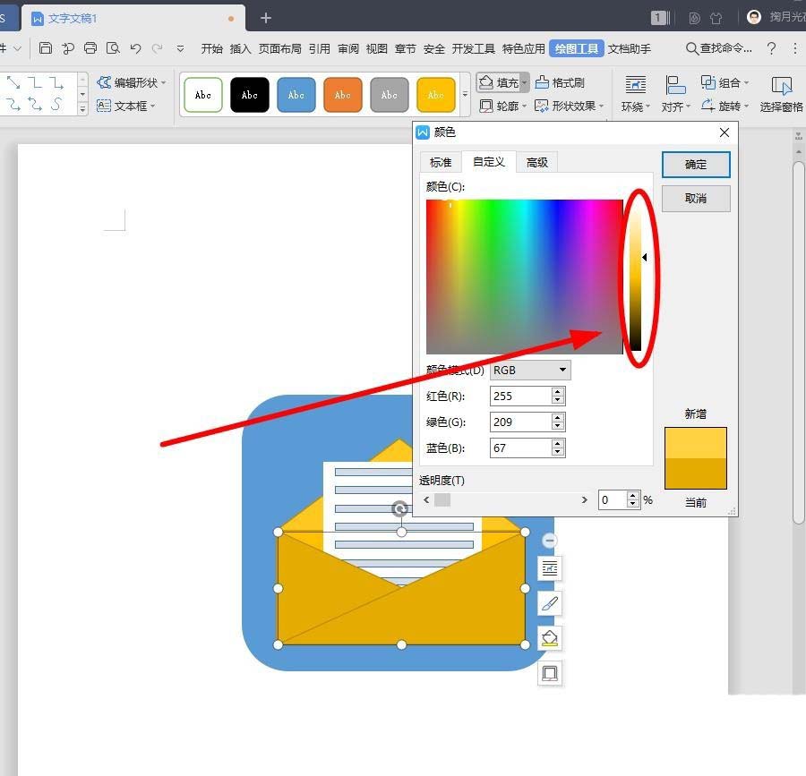 7、在“颜色”对话框中,调整颜色的深浅度来让封舌和信封主体有个区分,注意不要差别太大,调节完成,单击“确定”
