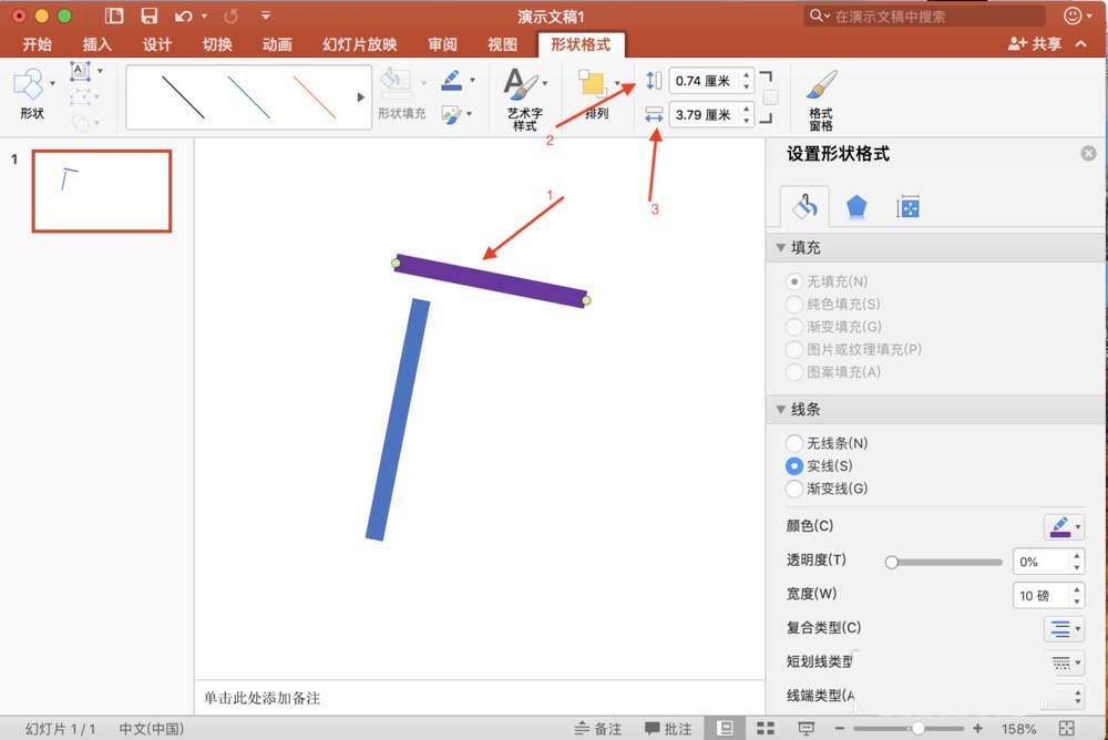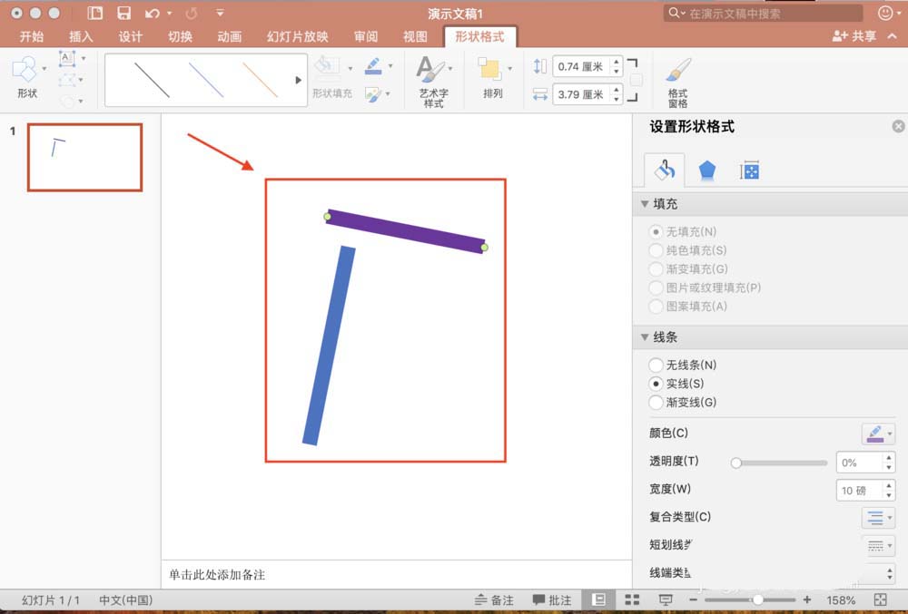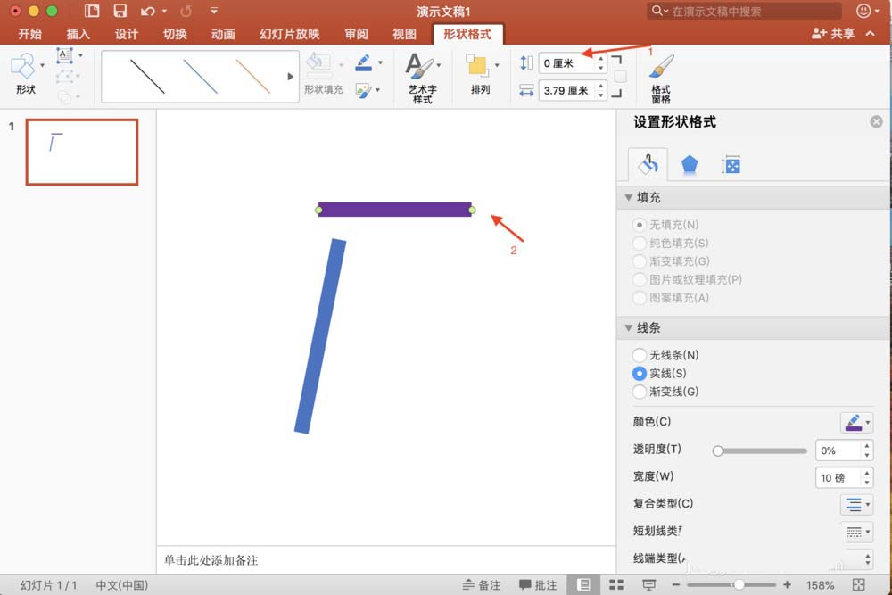 1、假设我们画出了如下两条横线和竖线两条图形,但是它们的位置和大小还不能满足要求